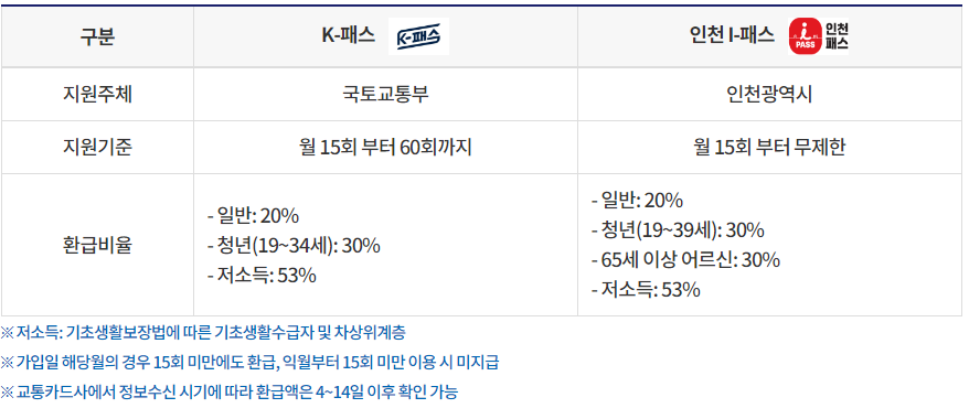 지원 주체가 다릅니다. K-패스는 국토교통부에서 지원하고, 인천 I-패스는 인천광역시에서 지원합니다.