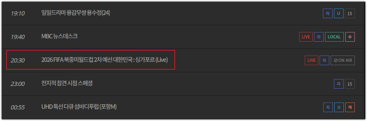 바로 아래에서 피파 월드컵 한국과 싱가포르 월드컵 아시아 2차 예선 축구 중계방송을 시청하실 수 있습니다.