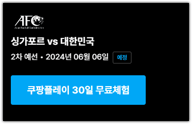 한국 싱가포르 월드컵 중계일정은 쿠팡플레이, SBS, MBC에서 시청가능합니다. 2024년 6월 6일 20시 30분에 경기 시청하실 수 있습니다.